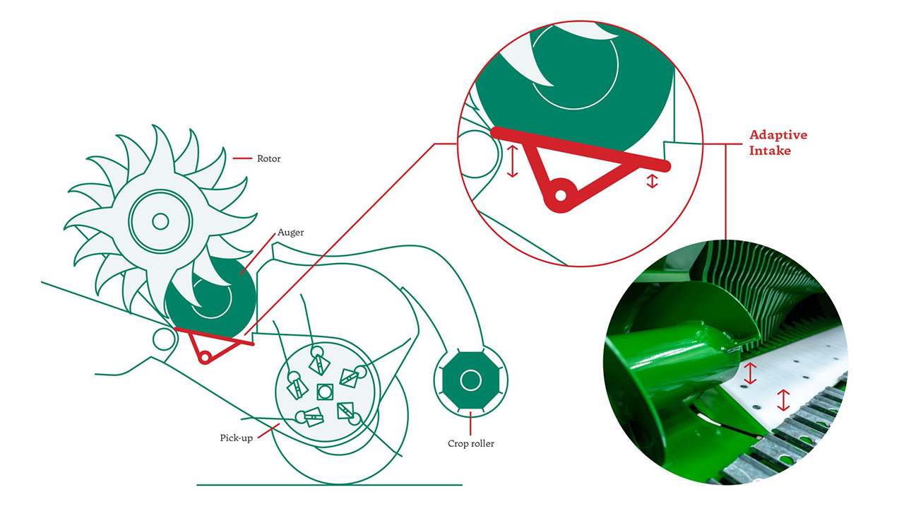 McHale har designet en adaptiv innmating som gjør at innmatinga automatisk justeres og tilpasses lette og tunge avlinger. Dette gjør at spissbelastninger kan unngås, og det kan oppnås maksimal gjennomstrømning og kapasitet uavhengig av høsteforholdene.